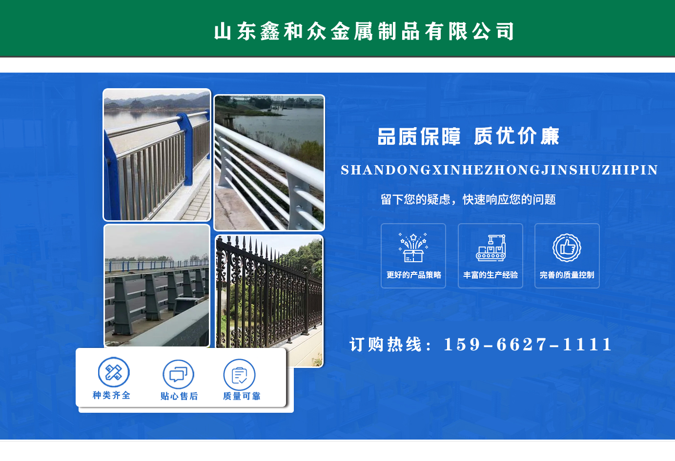 山東鑫和眾金屬制品有限公司主要產(chǎn)品有防撞護(hù)欄,橋梁護(hù)欄,道路護(hù)欄,河道護(hù)欄,不銹鋼護(hù)欄等護(hù)欄。提供設(shè)計(jì)方案,一站式定制,包您滿意價(jià)格優(yōu)惠,歡迎來電咨詢! 公司常年從事銷售護(hù)欄防撞護(hù)欄,橋梁護(hù)欄,道路護(hù)欄,河道護(hù)欄,不銹鋼護(hù)欄,橋梁鋼護(hù)欄,河道燈光護(hù)欄等。產(chǎn)品廣泛應(yīng)用于橋梁、河道、旅游景區(qū)、道路、公路、公園、小區(qū)、景觀、道路防撞等領(lǐng)域。 公司產(chǎn)品均采用優(yōu)質(zhì)不銹鋼材料,符合相關(guān)標(biāo)準(zhǔn)。各種型號(hào)不銹鋼復(fù)合管及護(hù)欄,質(zhì)量嚴(yán)格把控。產(chǎn)品強(qiáng)度高、耐腐蝕、焊接牢固、抗沖擊、性能好,防撞護(hù)欄結(jié)構(gòu)簡單、美觀實(shí)用大方?! g迎前來訂購!...